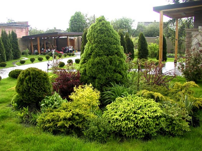 - Композиция и сочетания — сочетание хвойных с лиственными деревьями, кустарниками и цветами.