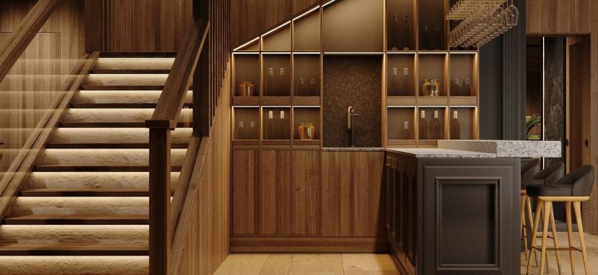 - Акцентное освещение. Используется для акцентирования объектов или зон, таких как картины или элементы декора. Это может быть освещение в витринах или подсветка полок.